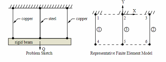 Length of wires (20 in.), spacing between wires (10 in.), and the reference temperature (70°F) are arbitrarily selected. The rigid lower beam is modeled by nodal coupling.