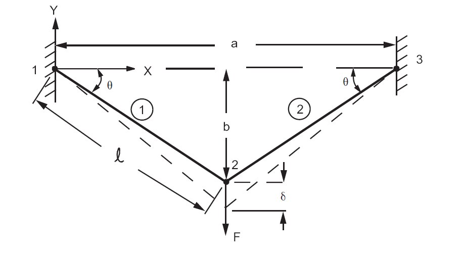 A structure consisting of two equal steel bars, each of length \(l\) and cross-sectional area \(A\), with hinged ends is subjected to the action of a load \(F\). Determine the stress, \(\sigma\), in the bars and the deflection, \(\delta\), of point 2. Neglect the weight of the bars as a small quantity in comparison with the load \(F\).