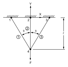 A chain hoist is attached to the ceiling through three tie rods as shown below. The tie rods are made of cold-rolled steel with yield strength \(\sigma_{yp}\) and each has an area A. Find the deflection \(\delta\) at load \(F_1\) when the deflections are elastic in all three rods. When the frame is loaded to \(F_2\) (where all three rods become fully plastic), and then unloaded, find the residual stress \(\sigma_r\) in the central rod.