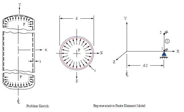 An arbitrary axial length of 10 inches is selected. Nodal coupling is used in the radial direction. An axial force of 5654866.8 lb (\((Pπd^2)/4\)) is applied to simulate the closed-end effect.